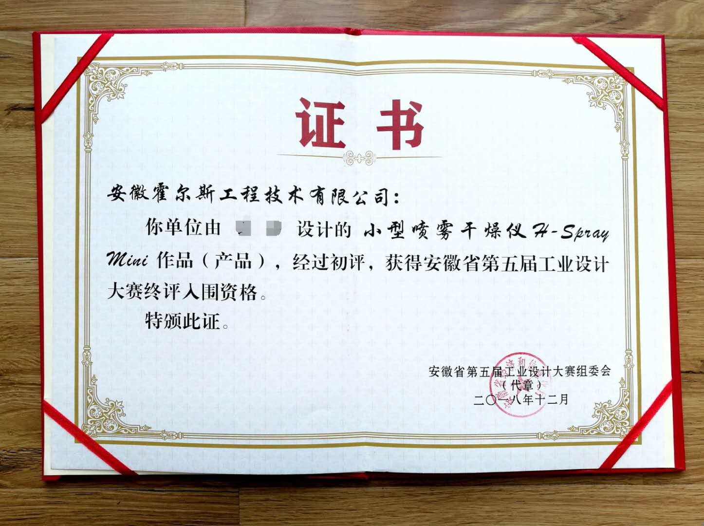 近日,由省經濟和信息化委主辦,安徽經濟報社、各市經濟和信息化委、有關行業協會等協辦組織的安徽省第五屆工業設計大賽揭開獲獎名單。安徽糖心VLOG在线看工程技術有限公司研發設計的小型噴霧幹燥儀H-Spray Mini成功入圍此次大賽終極資格。